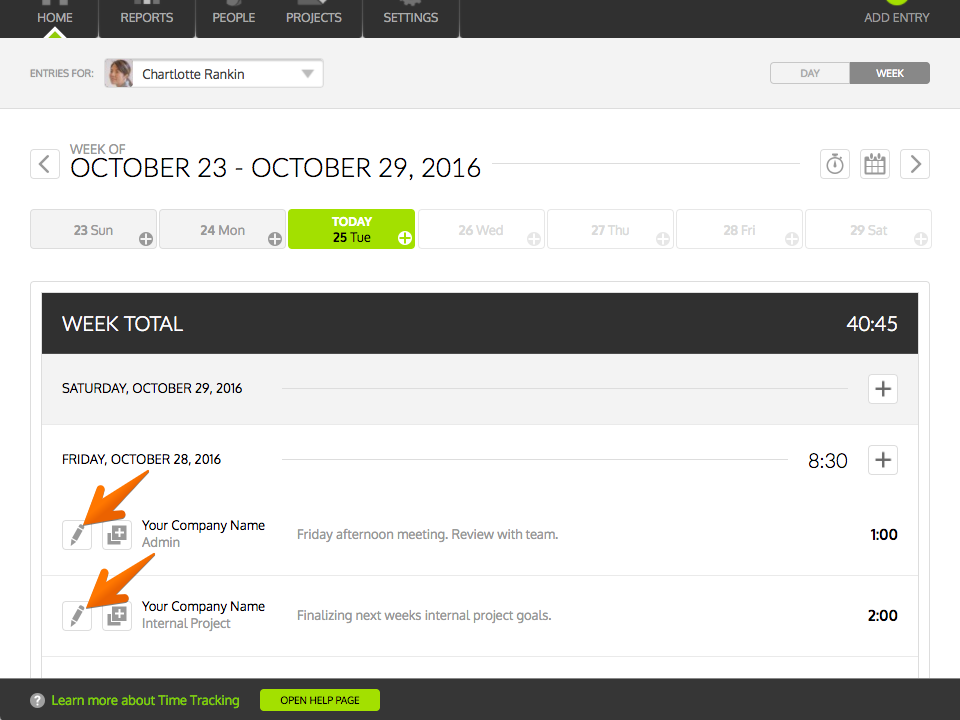 Or, you can add a time entry for the current day using the ‘Add Entry’ button at the top of the page.